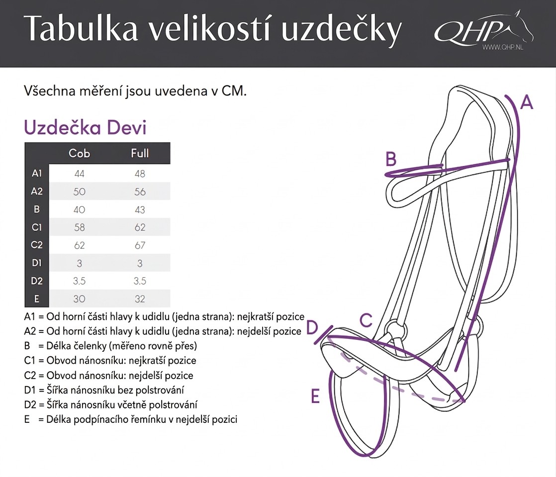 Anatomicky tvarovaná uzdečka je vyrobena tak, aby vyvíjela co nejnižší tlak na citlivá místa na hlavě a je tak vhodná i pro více senzitivní koně. Tvar nánosníku je upravený tak, aby se vyhnul citlivějším oblastem ve spodní části nosu, zároveň netlačí na zuby a zvyšuje tím komfort v hubě koně. Nátylník je extra široký a tvarovaný tak, aby se vyhnul uším a rozložil tlak co nejvíce rovnoměrně. Elegantní vzhled dodává uzdečce čelenka zdobená kamínky ve zlaté barvě a jemné, bílé prošívání. Zapínání je na klasické přezky, je vyrobeno z mosazi ve zlaté barvě. Součástí uzdečky jsou bavlněné otěže se zarážkami.