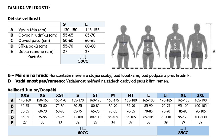 Pro velikosti XXS - L je vhodná velikost bombičky 60CC.