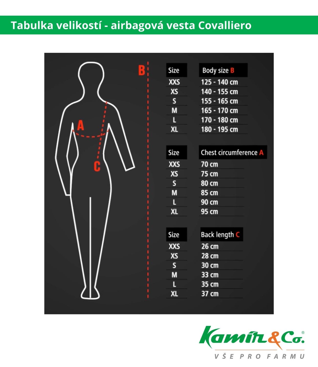 Kvalitní a spolehlivá airbagová vesta Covalliero poskytuje jezdci maximální pohodlí a ochranu. Při pádu se po odtržení trhačky vesta nafoukne a chrání tak nejzranitělnější místa. Vesta je aktivována v případě pádu při rychlosti nafouknutí 0,3 sekundy. Vesta je velmi lehká a pohodlná a aby byla zajištěna její správá funkce měla by se nosit pouze na lehkou vrstvu oblečení, nebo přes závodní sako. Lze ji použít i pod sako, sako ale musí být speciálně elastické, jinak by jej vesta roztrhla.