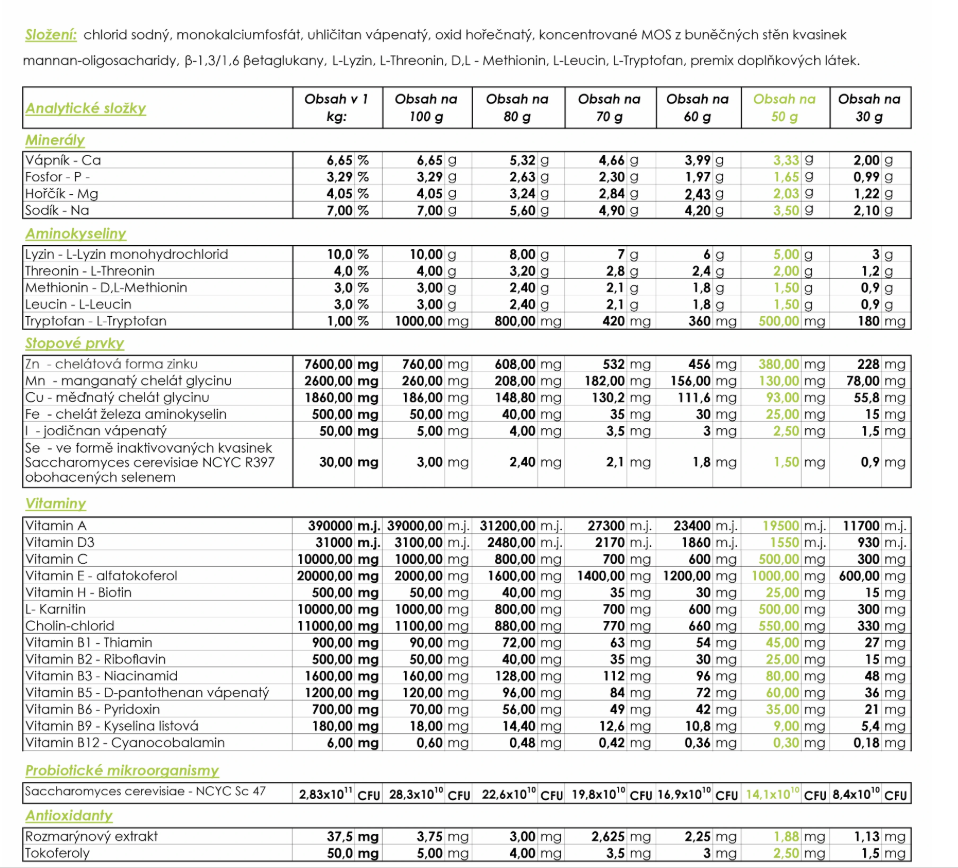 | Forma krmného doplňku | sypká nebo granulovaná |