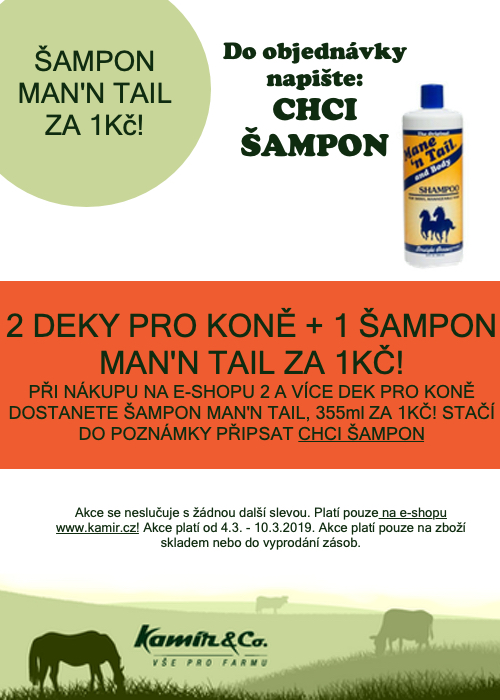 Od 4. 3. 2019 do 10. 3. 2019 při nákupu 2 a více dek pro koně na našem eshopu s chovatelskými a zemědělskými potřebami www.kamir.cz máte možnost obdržet dárek - šampon Man'n Tail za 1,- Kč.