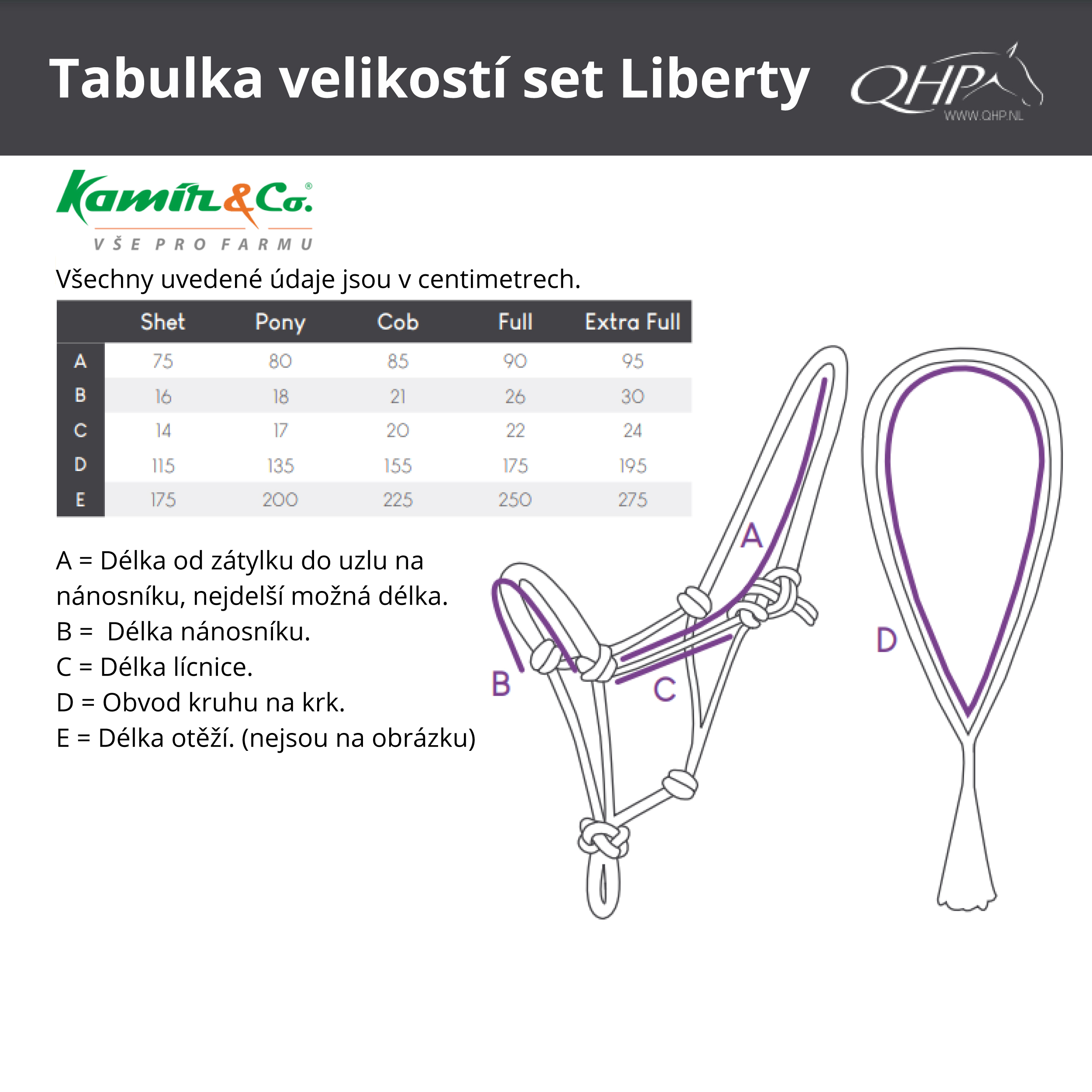 Lano má šířku 10 mm a v oblasti nátylníku a nánosníku je ohlávka setu obšitá. Ohlávka i kruh jsou zdobené třásněmi a přívěsky na malých karabinách, které lze sundat nebo umístit jinam.